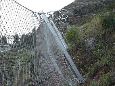 被動邊坡防護網(wǎng)被動保護系統(tǒng)由鋼絲網(wǎng)、高強鋼絲網(wǎng)、錨桿、工字鋼柱、上下錨索、消能環(huán)、底座、上下支撐繩等部件組成,該系統(tǒng)由鋼柱和鋼絲繩網(wǎng)組成一個全體,對保護區(qū)形成邊坡防護,以防止崩塌巖石墜落,發(fā)揮邊坡防護效果。